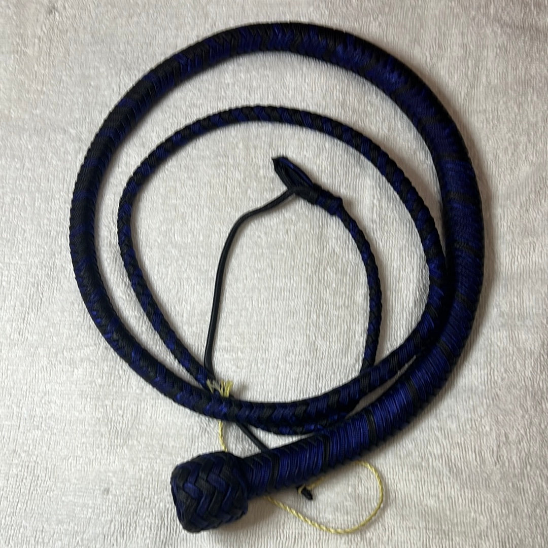 6' (including fall measured to nearest foot) paracord snake whip in black and blue. Metal concho. This whip has been soaked in paraffin wax and can start out a bit stiff but loosens up with use. Flaking of the wax does occur but can be cleaned using a heat gun or indirect heat from a lighter or torch. Comes with a Kevlar popper attached.