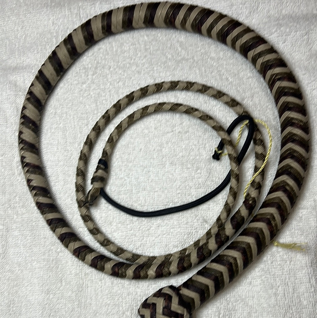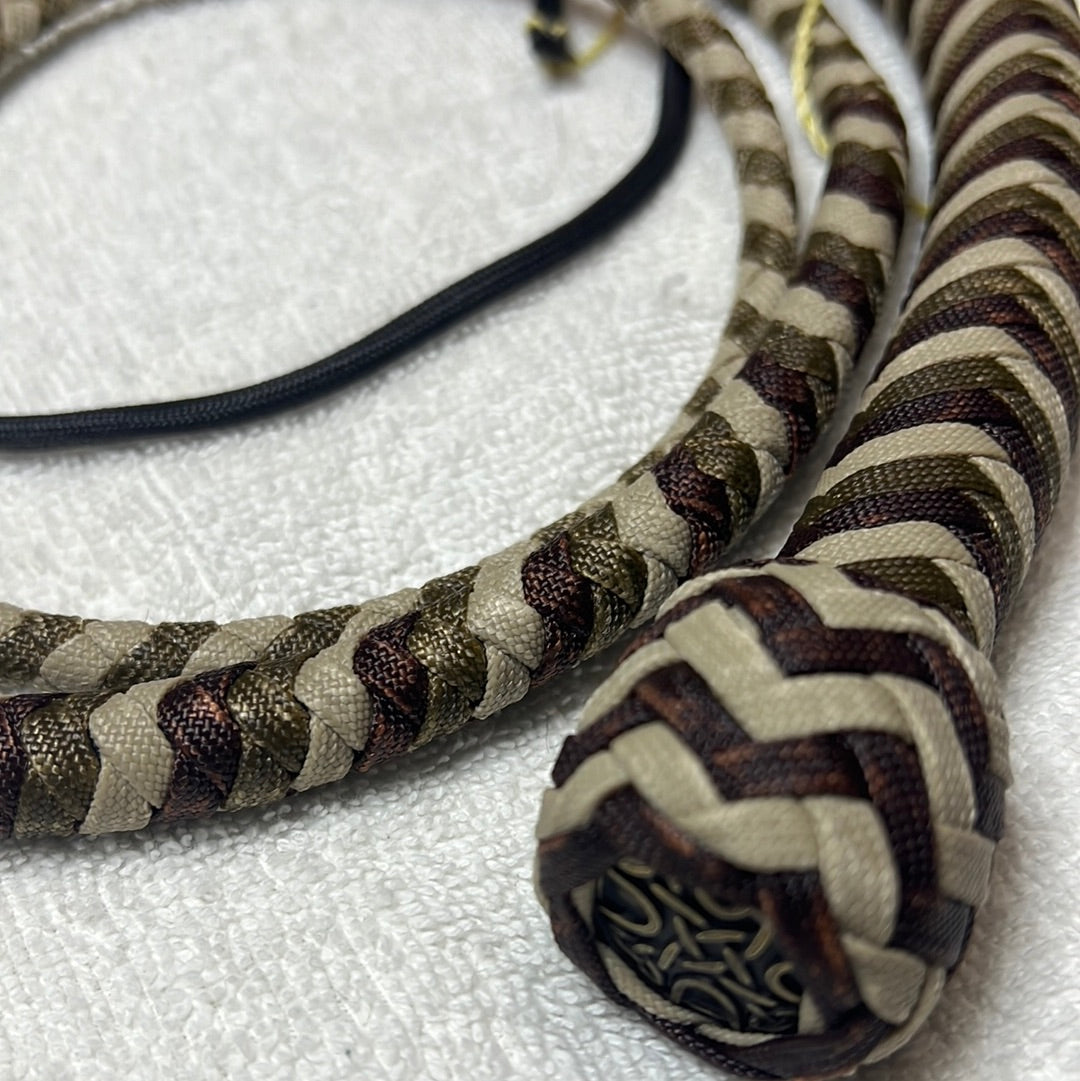 6' (including fall measured to nearest foot) paracord snake whip in brown, dark beige, and tan. Metal concho. This whip has been soaked in paraffin wax and can start out a bit stiff but loosens up with use. Flaking of the wax does occur but can be cleaned using a heat gun or indirect heat from a lighter or torch. Comes with a Kevlar popper attached.